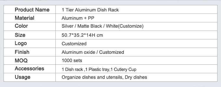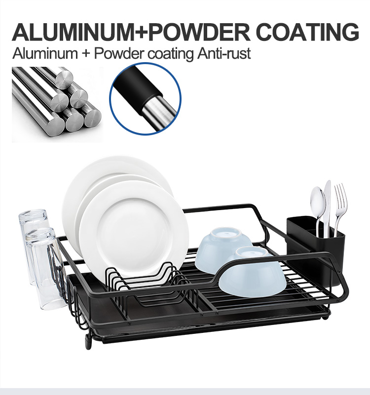 This Dish Drying Rack with Tray features an aluminum main structure. The material has excellent oxidation resistance, preventing rust and structural fatigue even with long-term use in high-humidity kitchen environments. The surface is available in silver, electrophoretic black, gold, or gray powder coating, with a coating thickness controlled within 60–80μm, enhancing wear resistance and overall appearance consistency, meeting the stable quality delivery requirements of B2B channels.