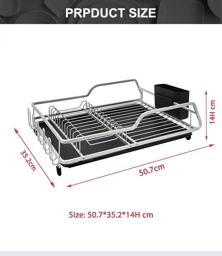 The product is a single-layer aluminum dish rack structure. The overall dimensions are optimized to accommodate standard 230–270mm diameter plates, bowls, and everyday glassware within limited countertop space. The structure height is kept within a reasonable range for easy access and cleaning, ensuring the Dish Drying Rack with Tray remains convenient to use even in small kitchens.