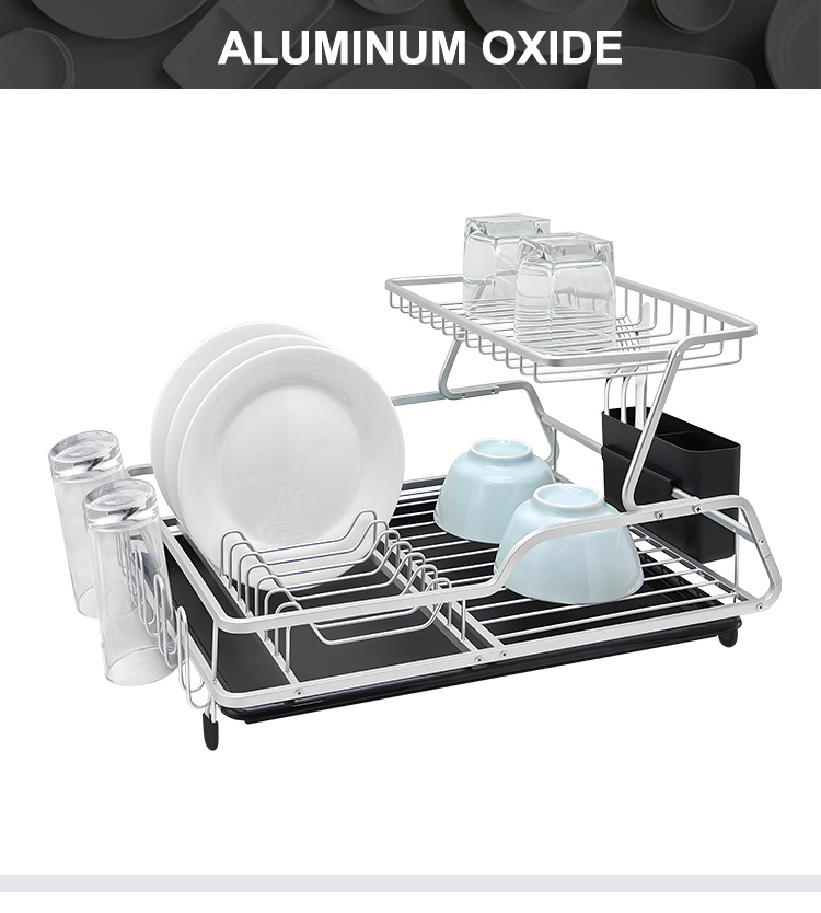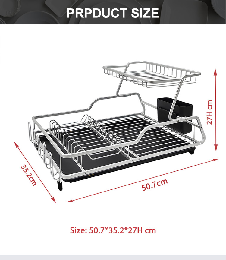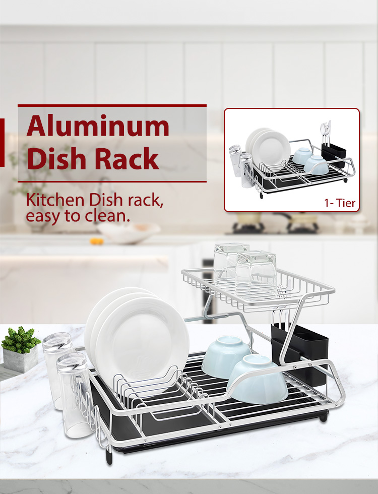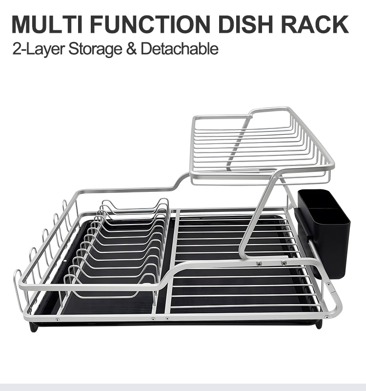 This Aluminum Double Tier Drying Rack features an aluminum alloy main structure. The material density is lower than stainless steel, keeping the overall weight in a lightweight range, making it easy to move and maintain. The aluminum surface is treated with a silver or powder coating, effectively reducing the risk of oxidation in humid environments and adapting to the high-humidity conditions of a kitchen. The main frame uses a sturdy welding process to ensure structural stability when holding multiple sets of tableware. The regular load-bearing capacity can meet the needs of placing multiple plates and bowls. Compared to iron structures, aluminum is easier to maintain its appearance over long-term use.