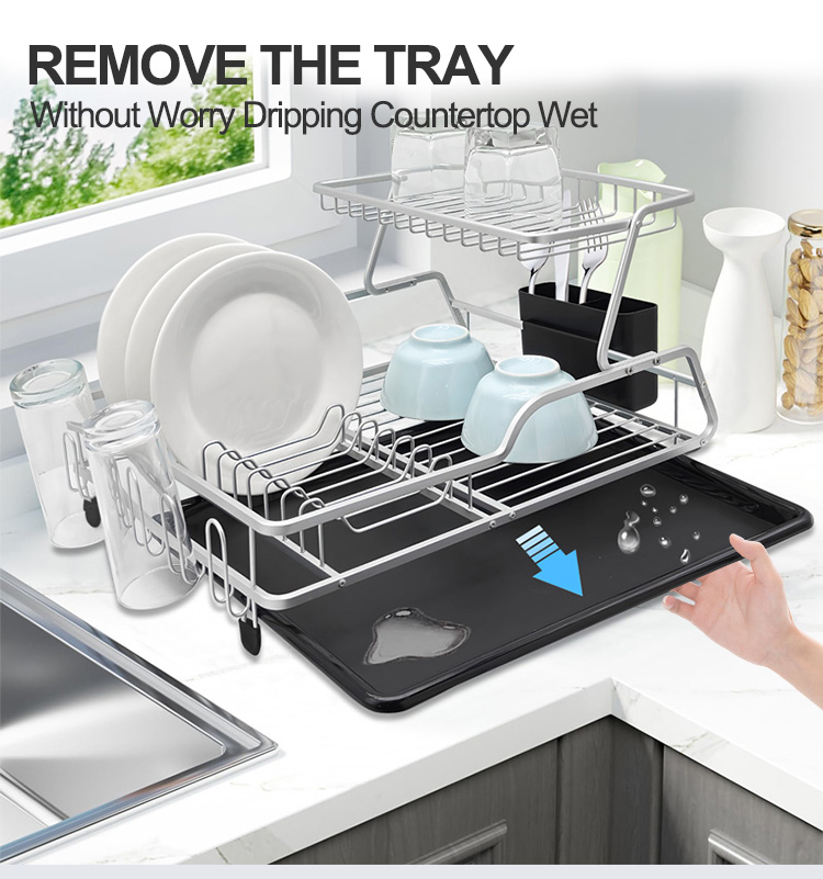 In a home kitchen environment, the Double Tier Drying Rack can be used for centralized draining of dishes after daily washing, separating plates from bowls and cups with its double-tiered structure. The aluminum body maintains stability in humid environments, contributing to long-term use. The drip tray reduces the frequency of countertop cleaning, keeping the work area tidy. The reasonable size proportions fit common kitchen countertop depths. This product helps improve the efficiency of daily organization in the home kitchen.