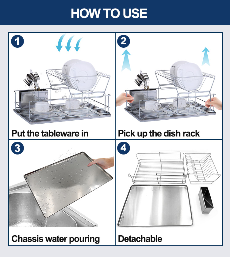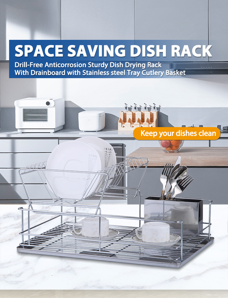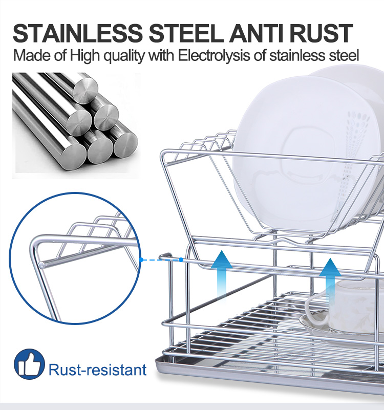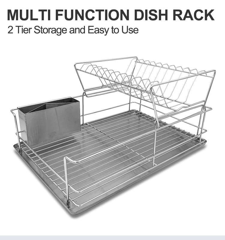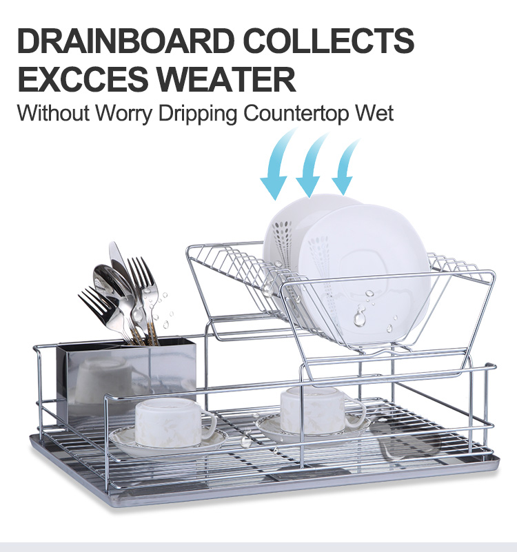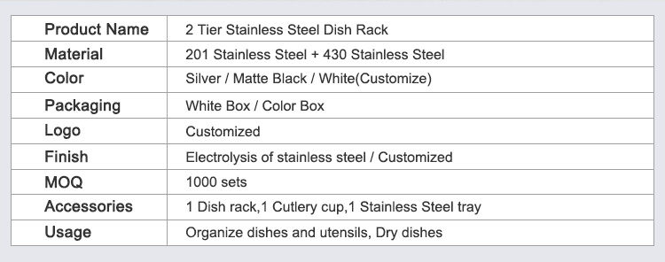 A stainless steel drainer is a kitchen storage rack used for draining and organizing tableware. It features a controlled drainage system that allows water to drain quickly from plates and bowls, while also keeping frequently used utensils organized and reducing countertop clutter. This Double Tier Stainless Steel Drainer features a double-layer structure. The upper layer has a slanted design for efficient water drainage, allowing plates to be placed upright and separated, minimizing contact and ensuring faster and more stable drying. The lower layer is a flat support area suitable for various items such as cups, bowls, and condiment dishes. It comes standard with a removable drip tray and a separate cutlery holder. Water drips into the tray for easy disposal, reducing countertop dampness and water stains. The main body is made of 201 stainless steel combined with 430 stainless steel components, and the surface can be electrolytically treated for enhanced corrosion resistance in humid kitchen environments, making it suitable for frequent use. It is available in silver, matte black, and white, and can be customized with a logo for project matching or bulk purchases.