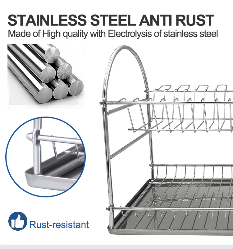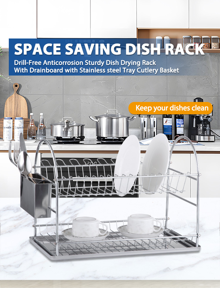 In the home kitchen countertop area, this Stainless Steel Large Dish Rack primarily serves the function of draining and organizing everyday tableware. The double-layer structure helps to organize multiple types of tableware efficiently within a limited countertop space. The metal material is suitable for long-term placement near the sink area. The overall design is simple and does not interfere with workflow. Suitable for typical home kitchen configurations.