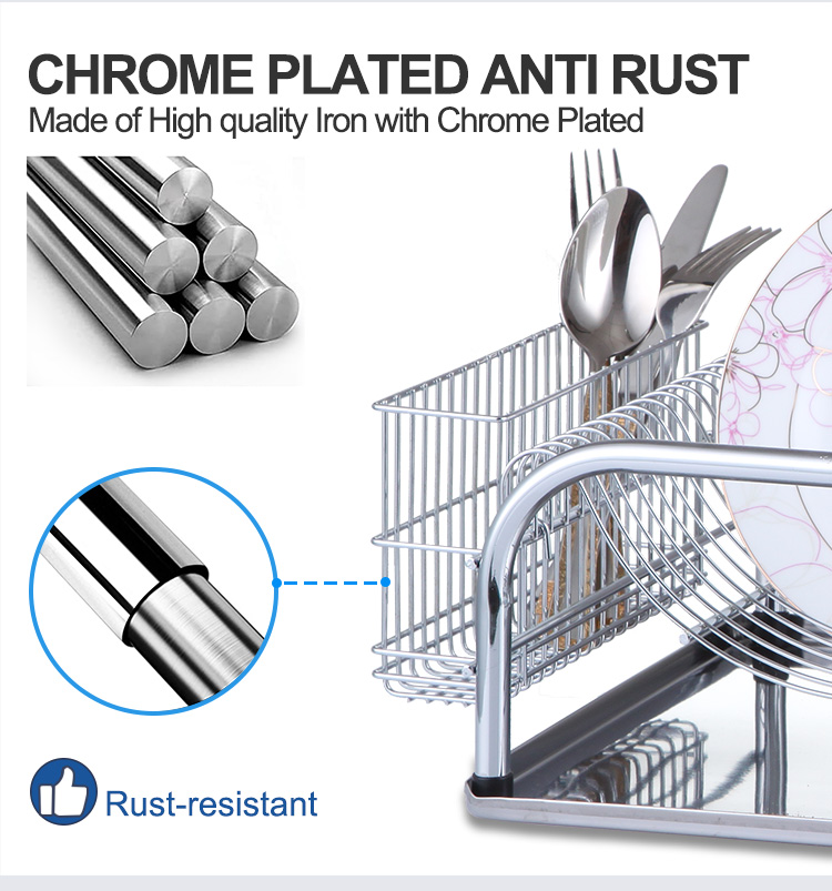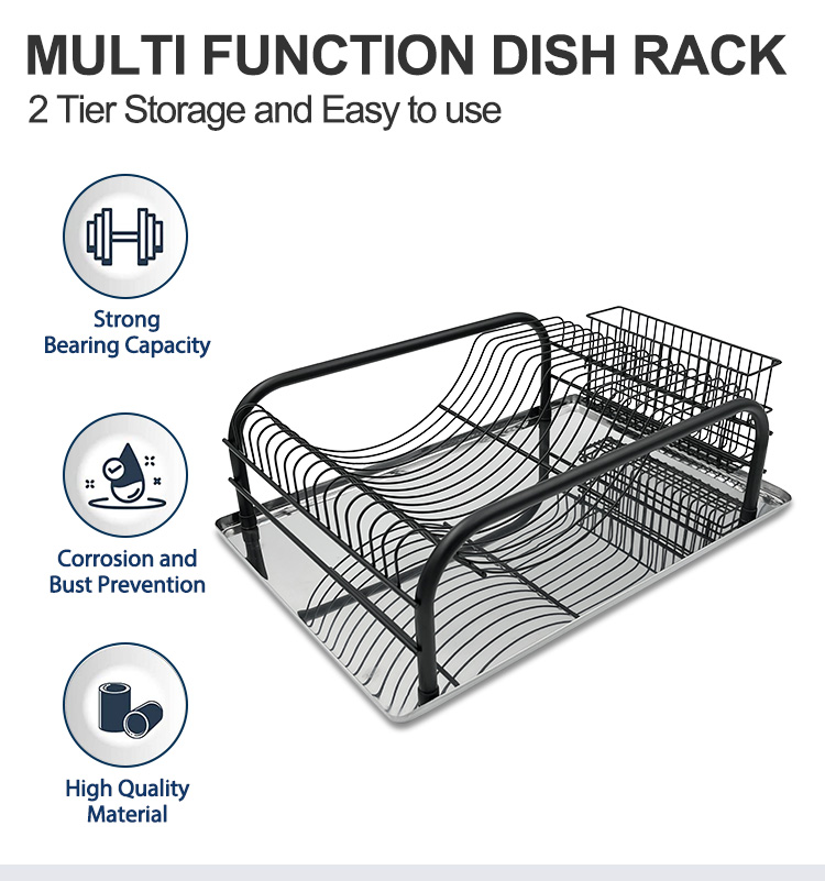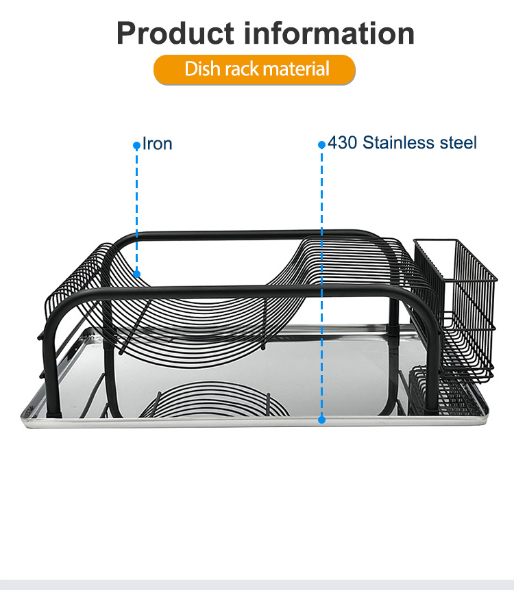 An Cast Iron Dish Rack is a countertop drying rack primarily constructed from iron, used to organize and dry washed plates, cups, and cutlery. Its open wire structure allows water to drain quickly and promotes airflow, enhancing natural drying efficiency. Compared to plastic or single-material racks, the iron structure offers superior rigidity and load-bearing stability for its size, making it suitable for frequent washing and drying of multiple dishes simultaneously. This Table Stand Cast Iron dish rack features a black metal wire design with a curved, ventilated structure that allows air to circulate from the sides and bottom, reducing water accumulation at the bottom of the dishes. It includes a smooth, chrome-plated drip tray at the bottom to collect water and prevent countertop dampness, making it easy to empty and clean. An integrated storage area on the side holds knives, forks, and small utensils, and it comes standard with a cup holder and a separate cutlery rack, providing clear separation for plates, cups, and other utensils.