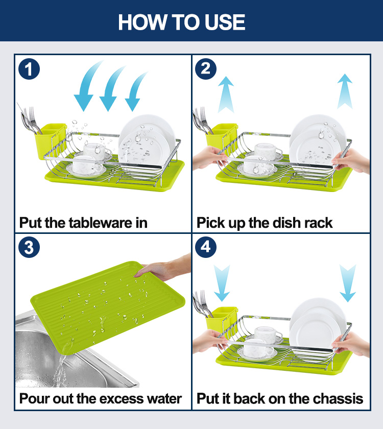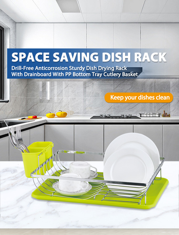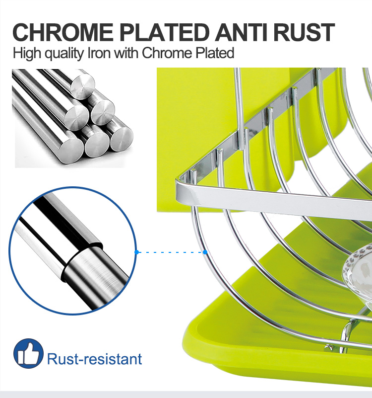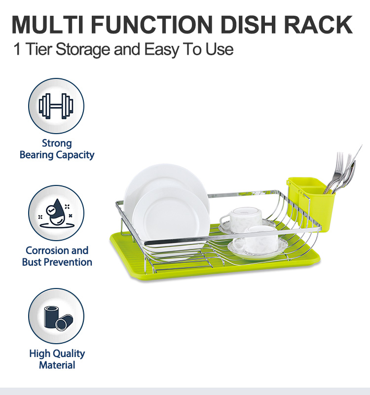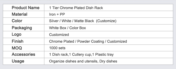 A Kitchen Dish Drying Rack is a storage rack used on kitchen countertops for draining and organizing tableware. Its core function is to centrally store washed plates, bowls, cups, and cutlery, using an open structure to improve air circulation, allowing water droplets to drain quickly and be collected in a tray, thus reducing countertop dampness, water stains, and clutter. This Modern Design Kitchen Dish Drying Rack features an iron frame as its main structure, with a surface that can be chrome-plated or powder-coated, maintaining structural strength while ensuring wear resistance and moisture resistance. It comes standard with a brightly colored plastic drip tray and a cutlery storage cup, creating separate areas for draining plates and storing cutlery. After washing, items can be placed directly back according to usage habits, shortening the organization process. The ventilated design allows water droplets to fall quickly under gravity, and the collected water in the tray can be easily emptied, reducing water accumulation on the countertop. Anti-slip feet are included at the bottom to reduce the risk of displacement during use.